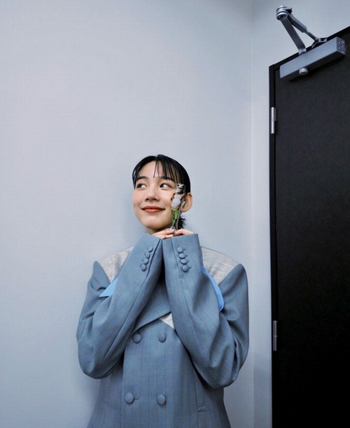 のんは同作で、物語の鍵を握る巨大な「かえるくん」の声を担当。「私はカエルくんの声を演じました」と紹介し、柔らかい笑顔やクールな表情を見せながらオーバーサイズの淡いブルーグレーのセットアップに身を包み、胸元にはライトブルーの大きなリボンをあしらったスタイリッシュな衣装でのオフショットを披露。