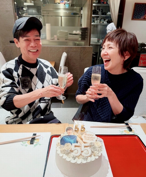 そして、アーガイル柄のニット姿で黒キャップをかぶった、夫でお笑いトリオ・ネプチューンの名倉潤とネイビーニット姿の渡辺が“Happy Birthday MARINA”と書かれたプレートと、“55”の数字の形のロウソクが華やかに飾られているバースデーケーキを前に、肩を寄せ合う笑顔ショットやシャンパングラスを持ちながら見つめ合う仲睦まじい夫婦ショットとともに、「週末に家族がお祝いしてくれて、楽しい時間を過ごしました」と喜びを明かした。