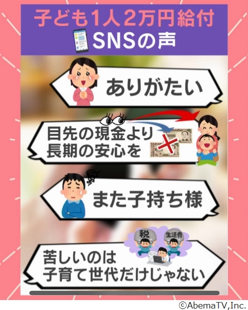 番組はこの日、政府が新たな経済政策として“子ども1人あたり2万円を児童手当に上乗せして給付する案”を発表した話題をピックアップ。SNSでは「ありがたい」「目先の現金より長期の安心を」「また子持ち様」「苦しいのは子育て世代だけじゃない」など、さまざまな反応が寄せられている。