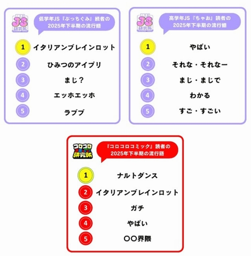 調査ではまず、今年の流行語について聞いていくことに。低学年女子(「ぷっちぐみ」読者)の1位は「イタリアンブレインロット」(※AIにより生成された架空のオリジナルキャラクターたちの総称)。SNSの動画トレンドが低年齢層にまで浸透しているようだ。これは男子(「コロコロコミック」読者)でも2位にランクインしており、性別を超えたトレンドの強さを示している。