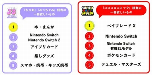 また、“一番欲しいもの”についての質問では、女子は「本・まんが」のほか、3位にキッズアミューズメントゲーム「ひみつのアイプリ」で使える「アイプリカード」、4位に「推しグッズ」がランクインし、コレクションしたものを見せ合ったり交換したりして、友人とコミュニケーションを取っている様子が想像できるランキングとなった。一方、男子は1位の対戦ホビー「ベイブレードX」のほか、4位「ポケモンカード」、5位「デュエ ル・マスターズ」と、人気のトレーディングカードゲームが上位に。集めるだけではなく、戦って遊べるものが人気が高いという結果になっている。