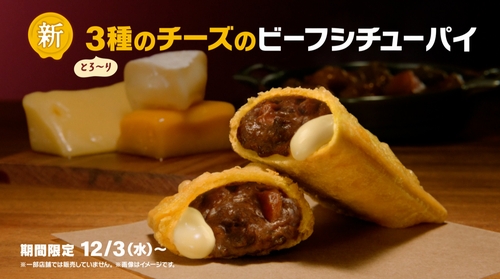 マクドナルドは12月3日から、カマンベールチーズ、チェダーチーズ、ゴーダチーズの3 種のとろ〜りなめらかなチーズが入って進化した新商品「とろ〜り3種のチーズのビーフシチューパイ」を、2026年1月上旬までの期間限定で販売する。価格は240円から(税込み)。